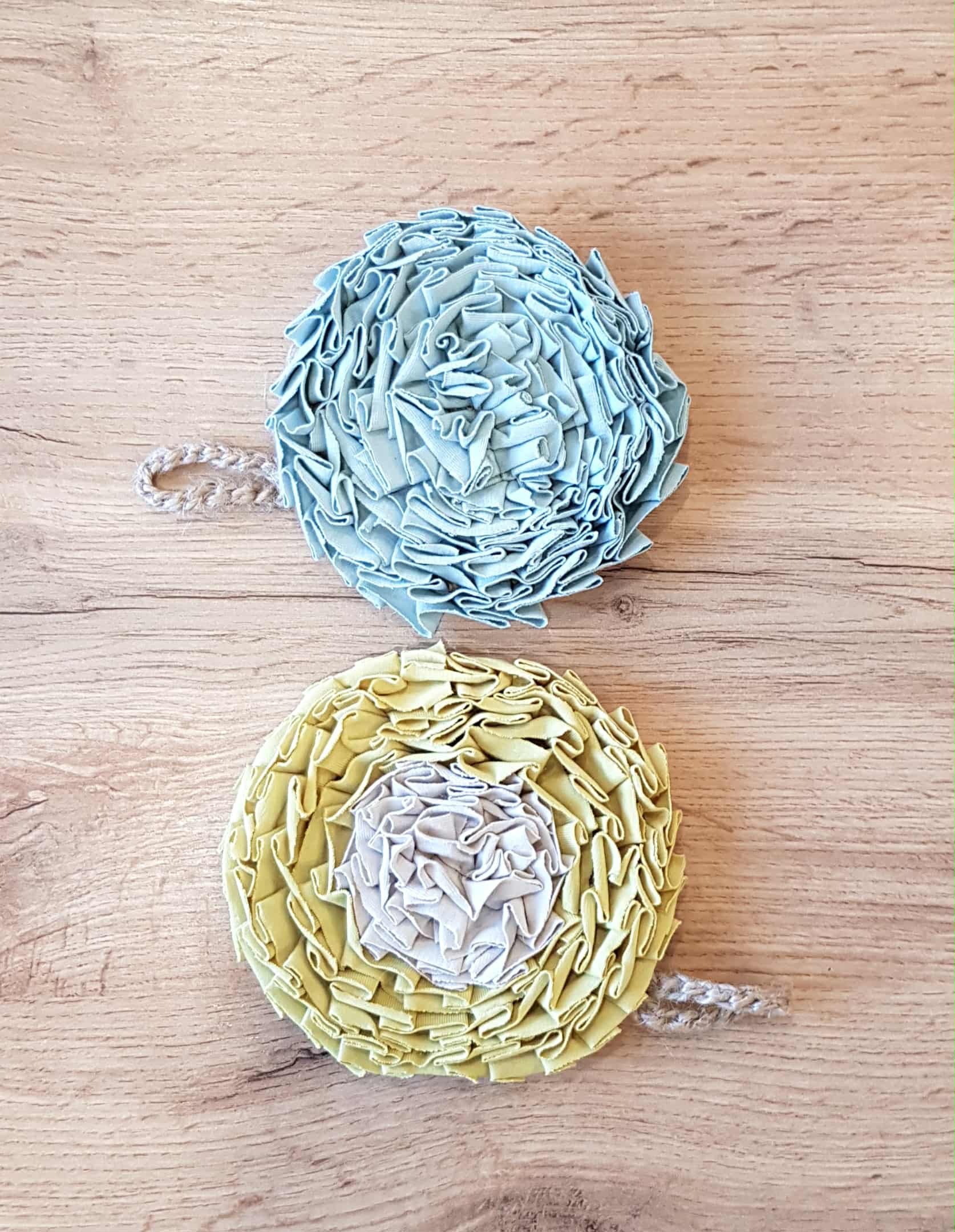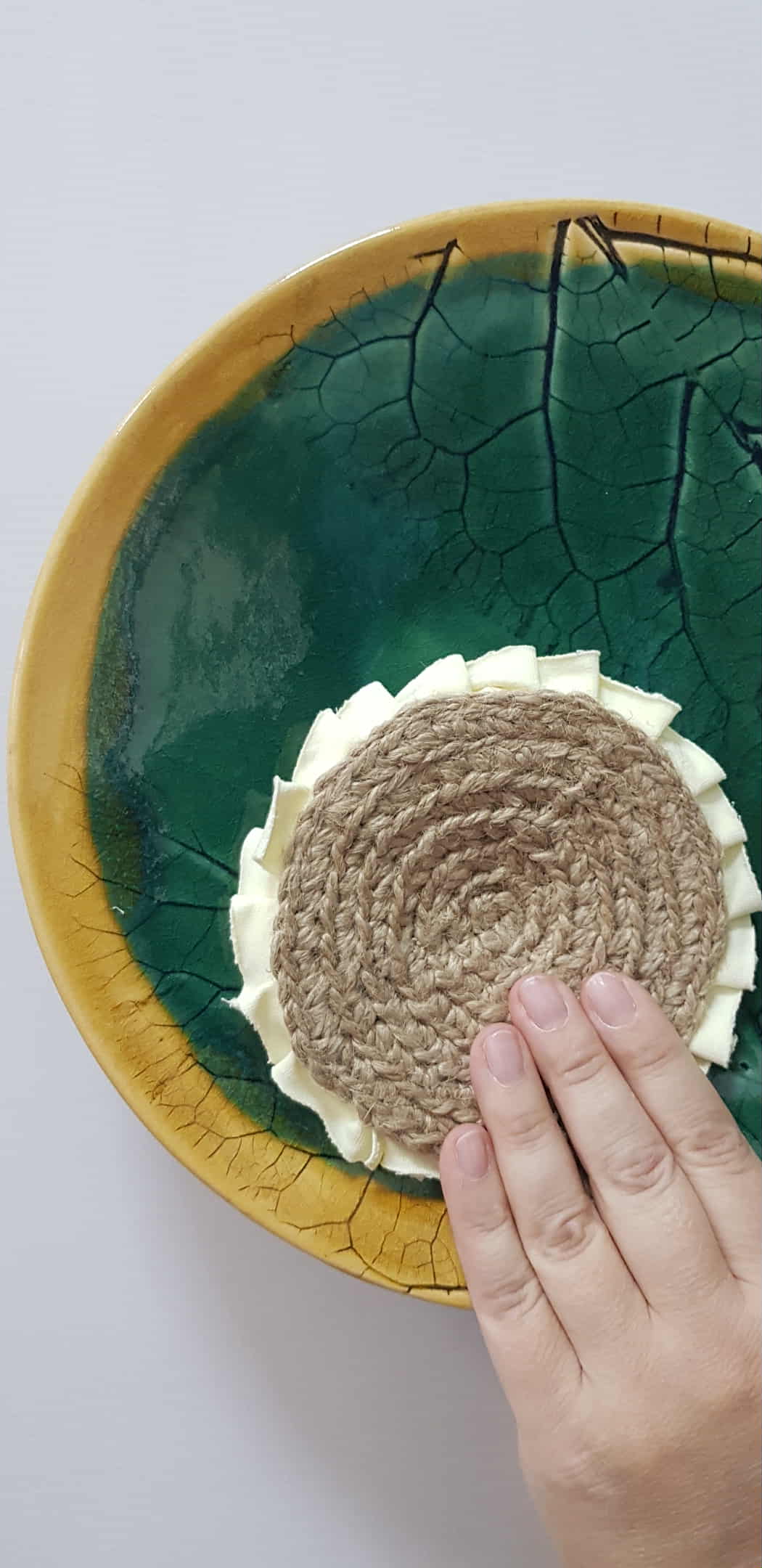 - Створення структури: внутрішній шар із текстильних відходів обгорнутим джутовим волокном, що створює двошарову губку: одна сторона жорстка (джут), а інша — м’яка (тканина).