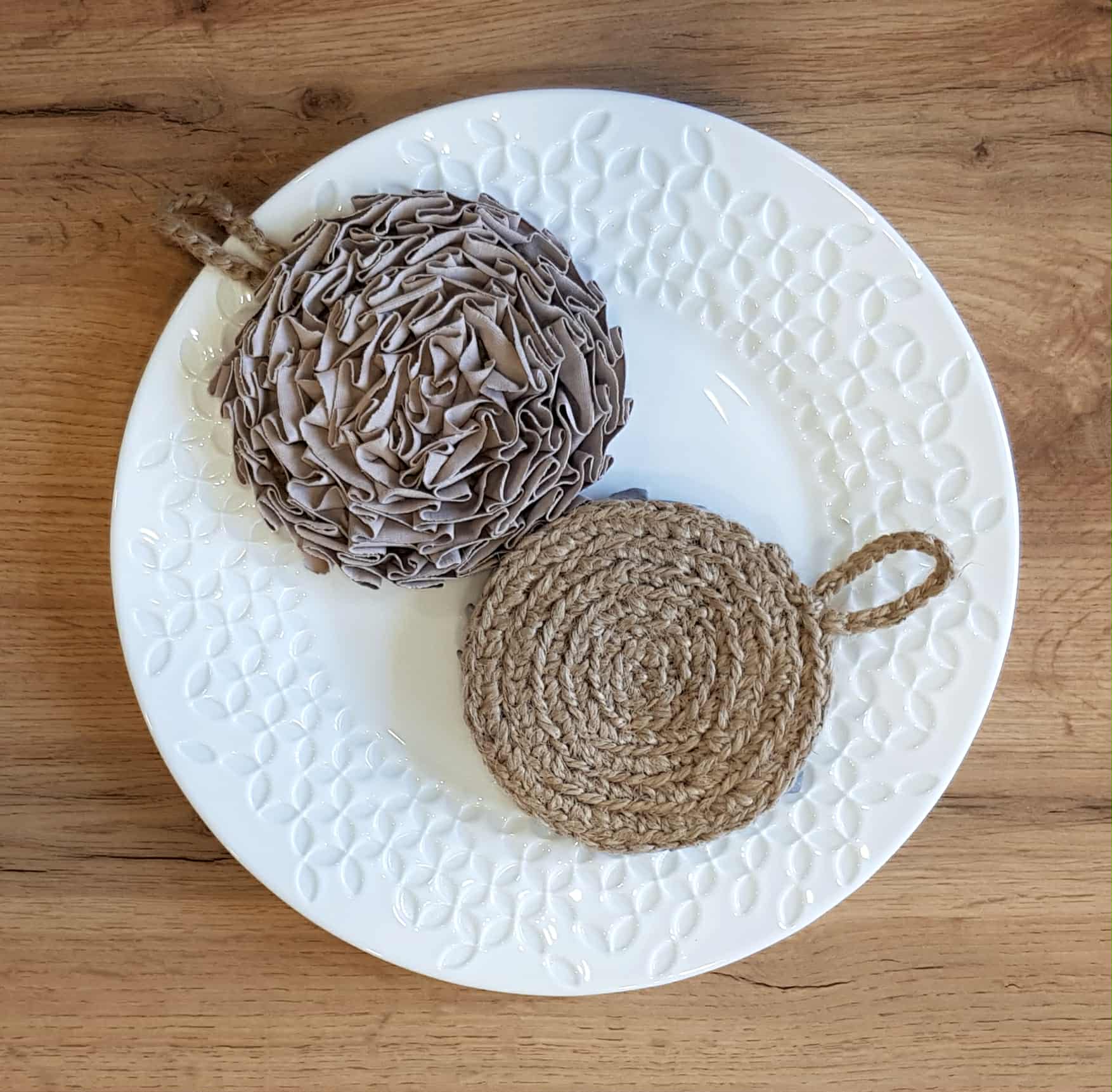 Губки для миття посуду з джуту та відходів швейного виробництва — це чудовий приклад переробки та екологічного підходу до ведення домашнього господарства.