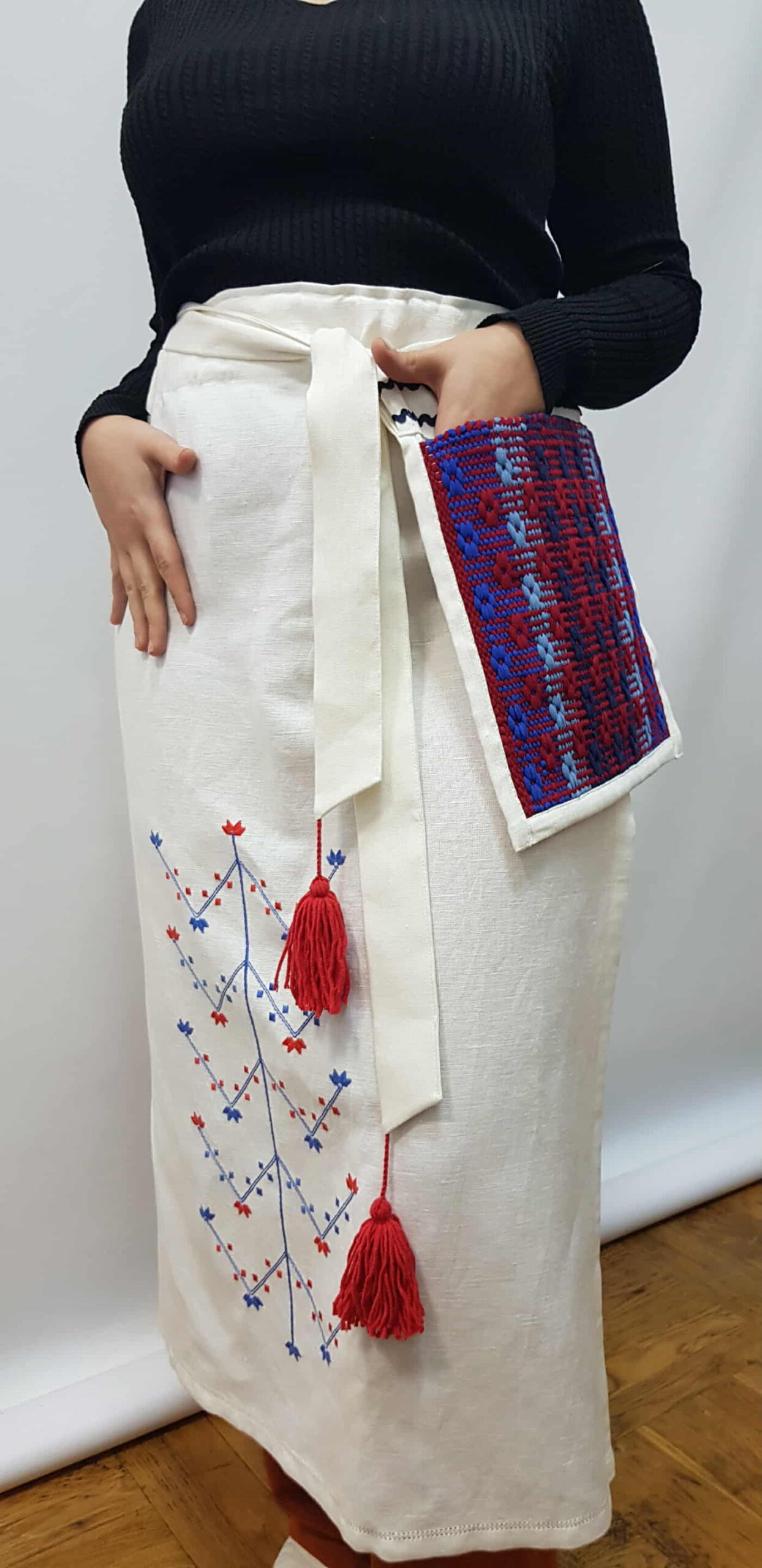 Запаска та фартух виконані з тканини та оздоблені ручною вишивкою. Центральну частину фартуха прикрашає стилізована вишивка “заквітчане поле”
